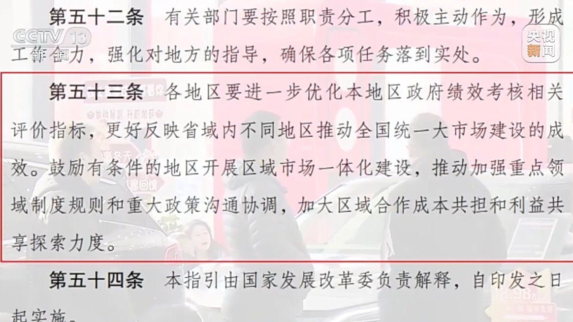 建設(shè)全國統(tǒng)一大市場,要求地方政府做到全國一盤棋,破除地方保護和市場分割。但人口和企業(yè)流動,會帶來經(jīng)濟數(shù)據(jù)和稅收的增與減,這也對地方政績考核標準提出了新的要求。為此《指引》提出,各地區(qū)要進一步優(yōu)化本地區(qū)政府績效考核相關(guān)評價指標,更好反映省域內(nèi)不同地區(qū)推動全國統(tǒng)一大市場建設(shè)的成效。