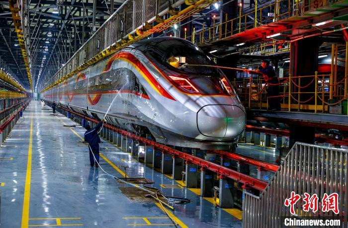 圖為修理庫中,工作人員清洗動(dòng)車。 張暢 攝