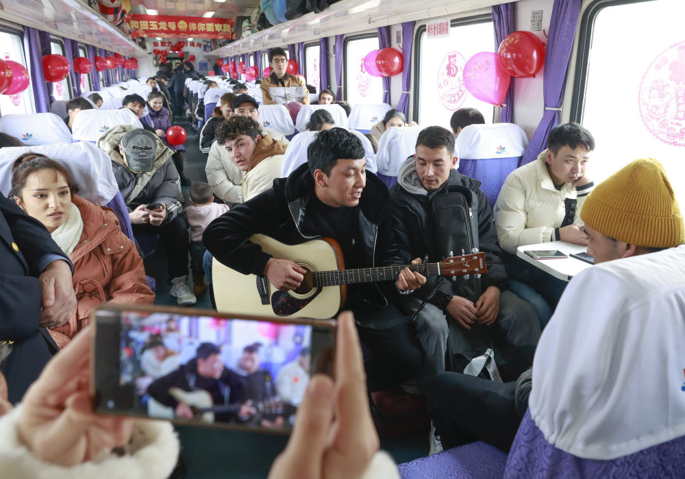在7557次列車上,旅客彈起吉他唱著歌。新華社記者 王菲 攝