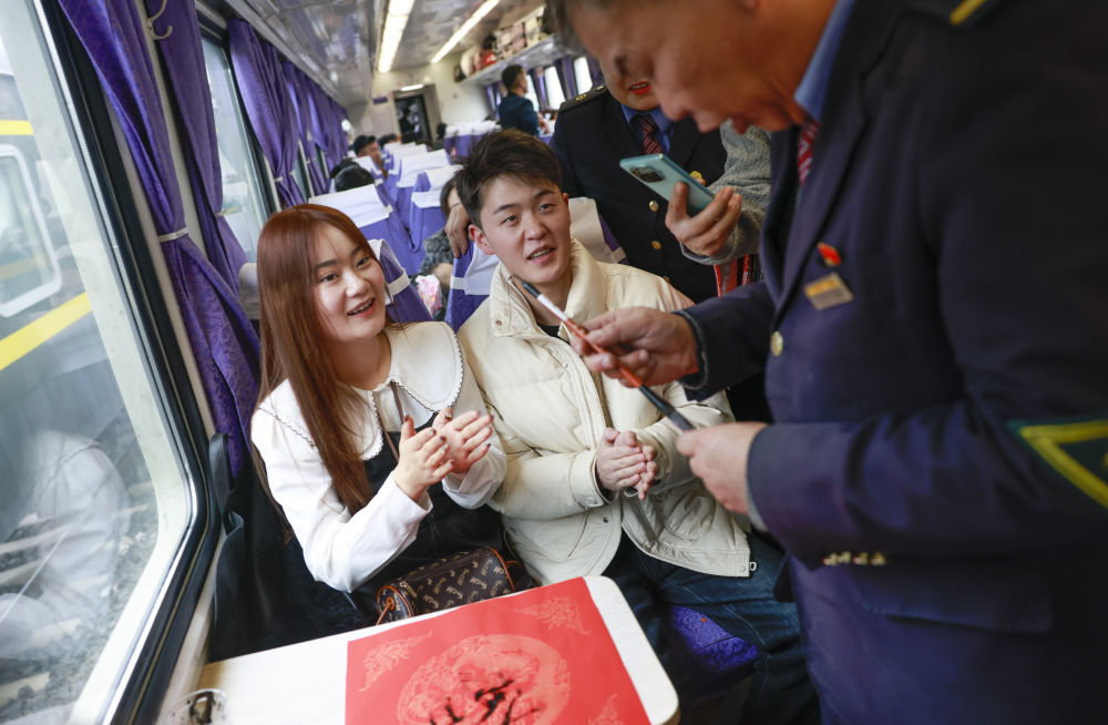 為了讓人們“滿載而歸”,列車員熱情組織旅客寫“?!弊?,還送上飽含心意的春聯(lián)、列車紀(jì)念徽章等禮物。