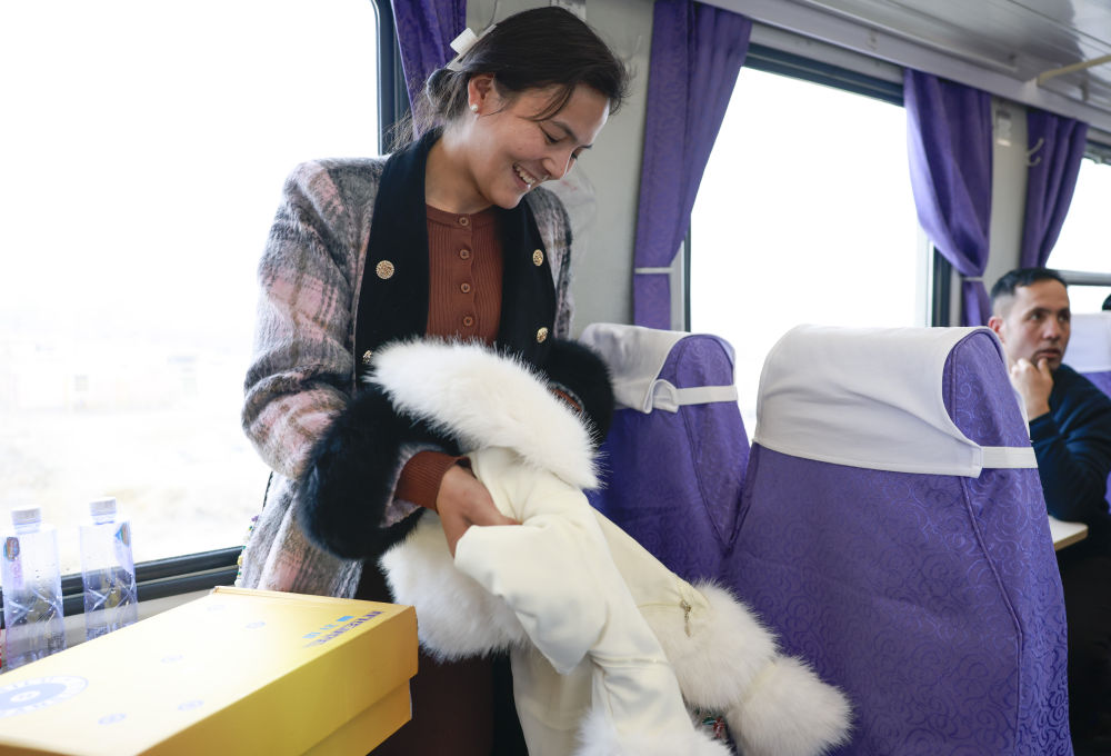一時(shí)間,車廂內(nèi)歡聲笑語,年味兒四溢。領(lǐng)到禮物的買合木提·阿布都瓦依提小心翼翼將春聯(lián)放進(jìn)背包,里面還裝著從烏魯木齊給女兒帶的新衣服、糖果、平板電腦。