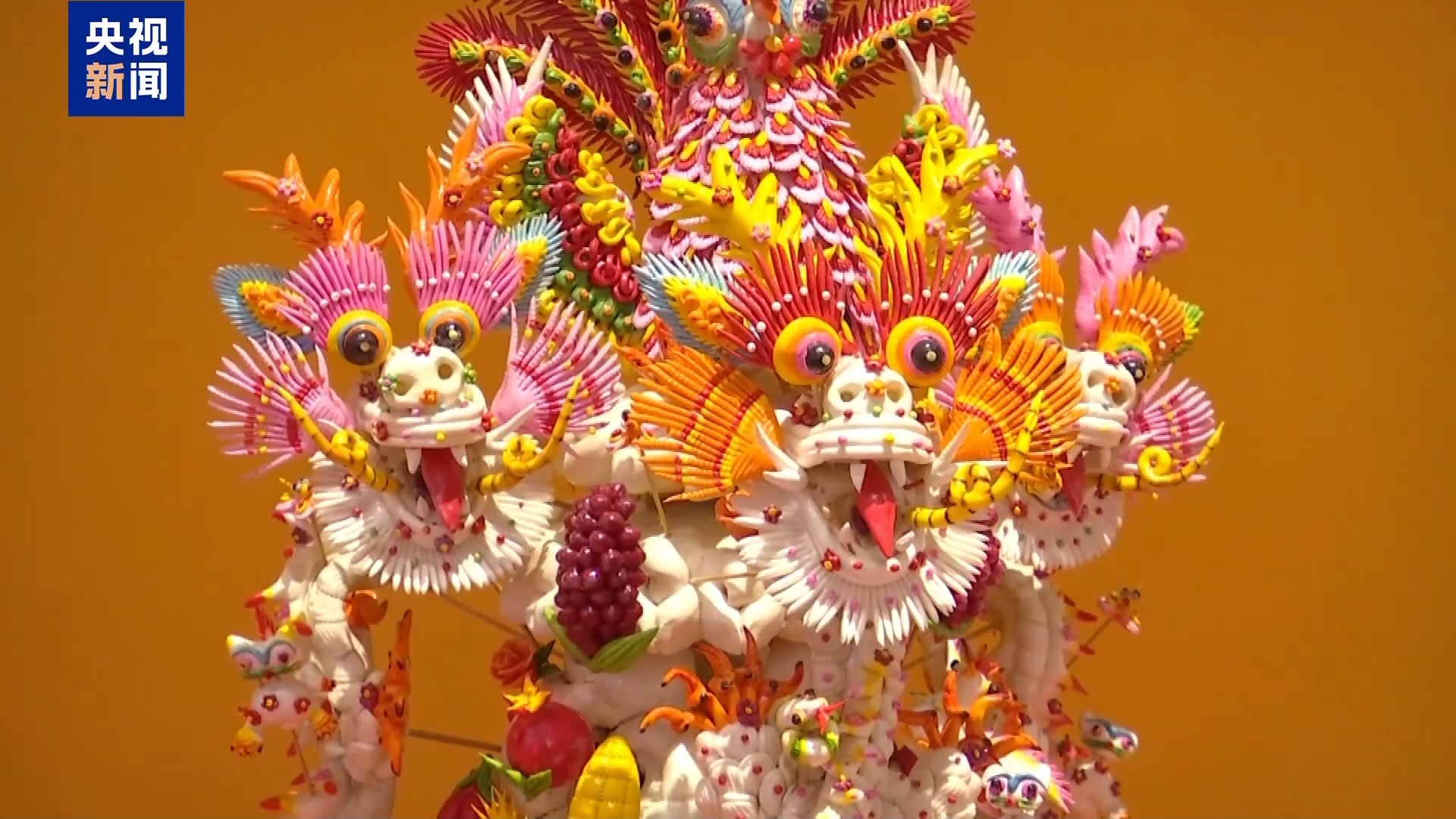 由地方非遺傳承人制作,傳統(tǒng)與創(chuàng)新兼具的面花作品《龍鳳棗山》,用搓、揉、編等10多道工序結(jié)合制作而成,吸引了不少觀眾駐足觀看。