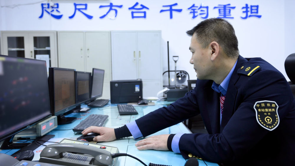 一間不大的值班室,除了床就是操作臺(tái),“咫尺方臺(tái) 千鈞重?fù)?dān)”的條幅下,田春緊盯顯示屏。他負(fù)責(zé)運(yùn)輸組織調(diào)度,是車站“最重要”的崗位。