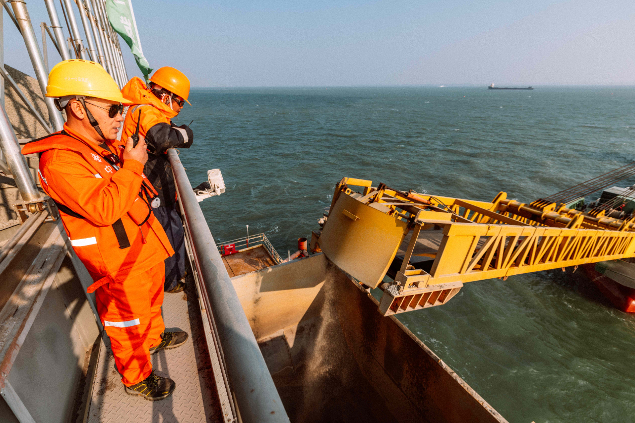 1月17日,夕陽下的廈門劉五店港區(qū),北風(fēng)勁吹。在距離中交一公局集團廈金大橋(廈門段)項目海上平臺混凝土操作員梁芝敬站立位置不到30米的洋面上,一艘船身印有“帆順168”字樣的補料船,裝載著4000多噸砂石緩緩抵近。船頭前方延伸出一條25米長的傳送皮帶,將船上的砂料源源不斷地送抵老梁眼前的鋼制固料斗內(nèi)。當(dāng)天他們要趁著海水退潮帶來的作業(yè)窗口,為站里補上700噸機制砂和900噸粒徑10到20毫米的小石子,以確?;炷琳旧a(chǎn)不停機。