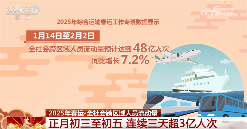 來(lái)自2025年綜合運(yùn)輸春運(yùn)工作專班數(shù)據(jù)顯示:1月14日至2月2日,全社會(huì)跨區(qū)域人員流動(dòng)量預(yù)計(jì)達(dá)到48億人次,同比增長(zhǎng)7.2%;正月初三、初四、初五已連續(xù)三天超3億人次,均超去年同期水平。