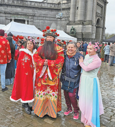 在比利時布魯塞爾舉辦的“中國春節(jié)游園廟會”上,當地觀眾與廟會演員合影。記者 牛瑞飛攝