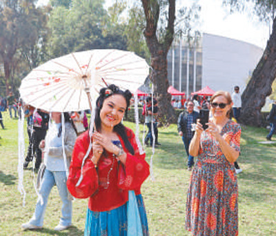 在墨西哥第四屆中國新年文化節(jié)上,當地青年身著中國傳統服飾留影紀念。本報墨西哥分社 埃內斯托·多明戈斯攝