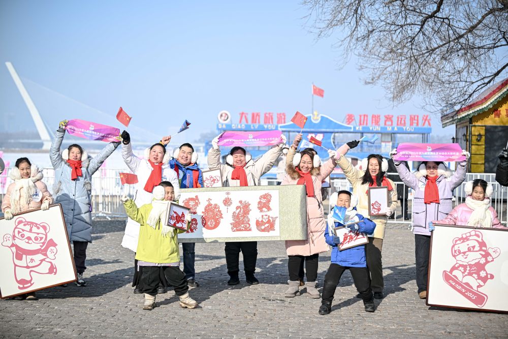 啦啦操、快閃合唱、街頭器樂演奏、國標舞、冰雕制作……沿途,豐富多彩的群眾活動營造出滿滿氛圍感。在五星紅旗的掩映下,濱洲鐵路橋煥然一新,高校大學生置身大型亞冬會主題畫框,合唱《我和我的祖國》,留下精彩一瞬。