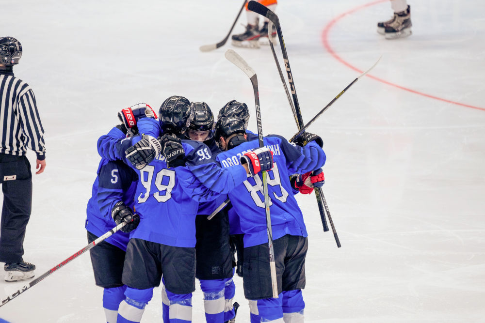 2月3日,科威特冰球隊球員在比賽中慶祝進球。新華社記者 王建威 攝