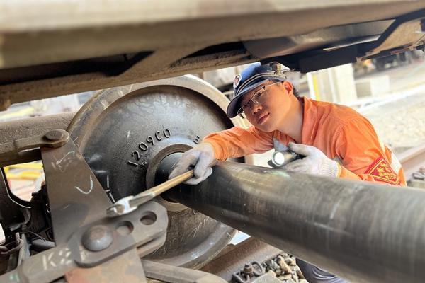 1時(shí)30分,作業(yè)人員攜帶道尺、檢查錘、油壺等材料工具,向站場(chǎng)西邊進(jìn)發(fā),點(diǎn)點(diǎn)頭燈猶如點(diǎn)點(diǎn)螢光,緩緩向前方移動(dòng)。10分鐘后,左自強(qiáng)抵達(dá)14號(hào)道岔,他彎下腰,將道尺卡在鋼軌間讀取數(shù)值。“0.5、0.4、0.5……”他邊檢查邊記錄,不放過(guò)一處問(wèn)題隱患。在一顆松動(dòng)螺栓處,左自強(qiáng)先用手旋緊,再用扳手緊固,最后雙手用力下壓扳手,直至螺栓紋絲不動(dòng)。“一顆螺栓松動(dòng),就可能帶來(lái)重大安全隱患。再細(xì)小的事情我們也要認(rèn)真仔細(xì)地做好?!弊笞詮?qiáng)說(shuō)。