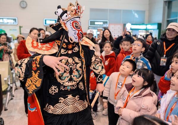 1月30日,Y987次“非遺主題”熊貓專(zhuān)列出發(fā)前,變臉演員正在與小游客互動(dòng)。孟寬/攝