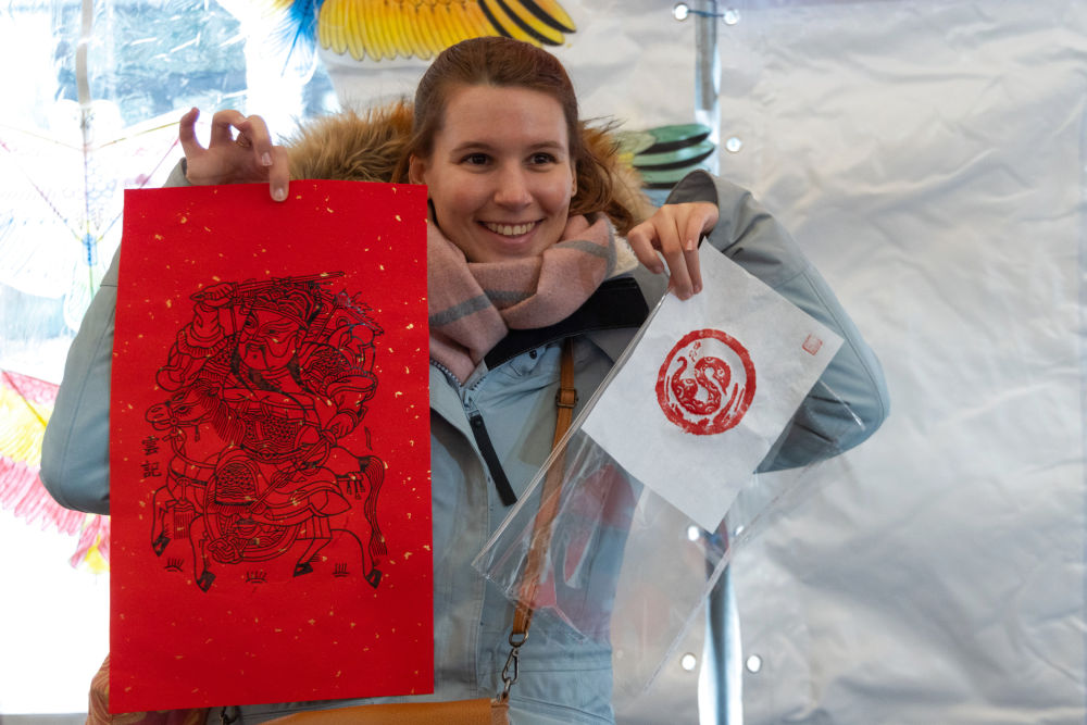 1月17日,在摩洛哥卡薩布蘭卡的“中國廟會”活動現(xiàn)場,摩洛哥民眾展示印有中國農歷蛇年主題圖案的木版水印作品。新華社記者霍晶攝