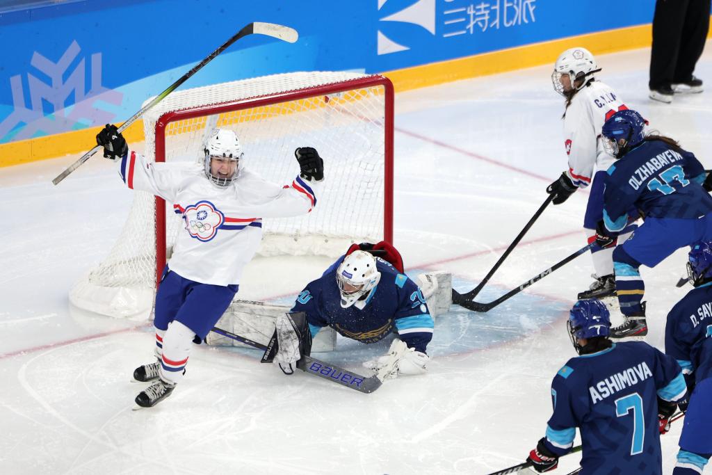 這里正在上演女子冰球B組一場焦點(diǎn)戰(zhàn),對陣雙方是中國臺北隊與哈薩克斯坦隊,比賽開場第五分鐘,中國臺北隊就打入一球,進(jìn)球的68號球員雙臂高高舉起,和隊友一起慶祝,觀眾席傳來的,是山呼海嘯般的歡呼聲。