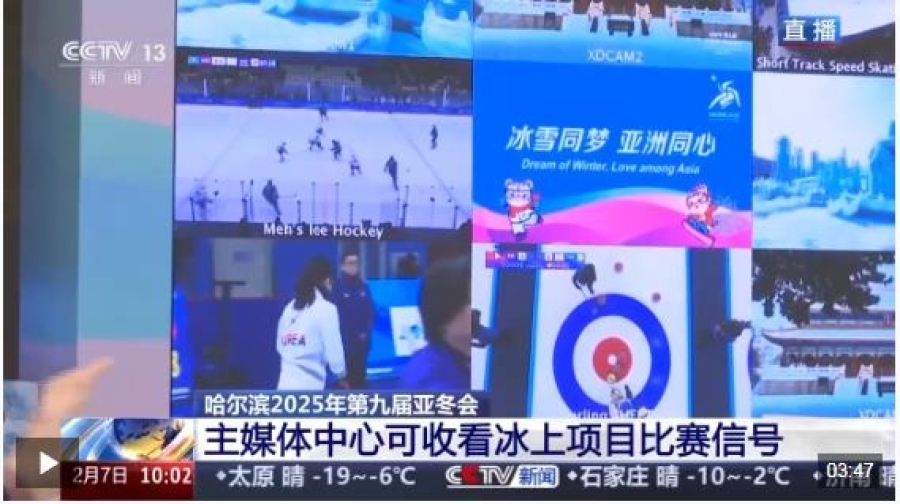 通過現場的大屏可以看到正在進行的比賽,大屏在賽時可提供所有冰上場館的9路信號,來自不同國家和地區(qū)的媒體記者可以根據自己的需求來選擇不同比賽場次信號來關注。