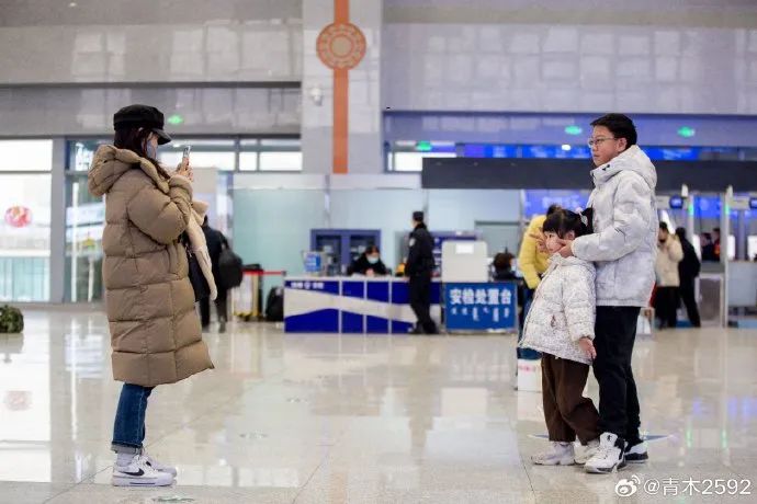在外地上班的于女士,帶著女兒和前來送站的親人在車站內(nèi)合影留念。