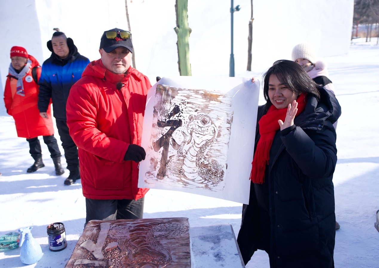 泰國駐華大使館二等秘書王安安在黑龍江省藝術(shù)研究院冰版畫研究院副院長盛琰的指導(dǎo)下,制作出冰版畫《畫蛇添?!?,用蛇的形狀和漢字的偏旁部首組合雕刻出漢字“?!辈⑼赜〕鰜恚耐袑χ袊r(nóng)歷蛇年的祝福。
