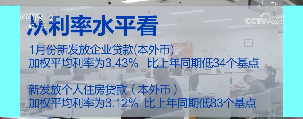 從利率水平看,貸款利率繼續(xù)保持在歷史低位。1月份,新發(fā)放企業(yè)貸款(本外幣)加權(quán)平均利率為3.43%,比上年同期低34個基點;新發(fā)放個人住房貸款(本外幣)加權(quán)平均利率為3.12%,比上年同期低83個基點。