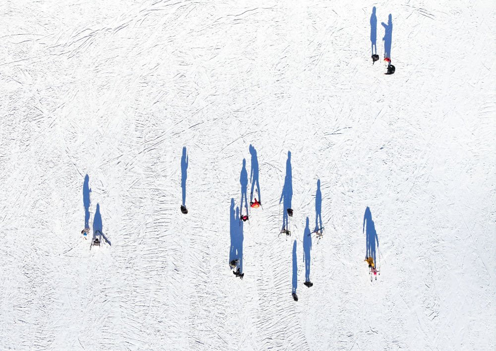 滑雪愛好者在內蒙古呼倫貝爾扎蘭屯市金龍山滑雪場滑雪(無人機照片)新華社記者連振 攝