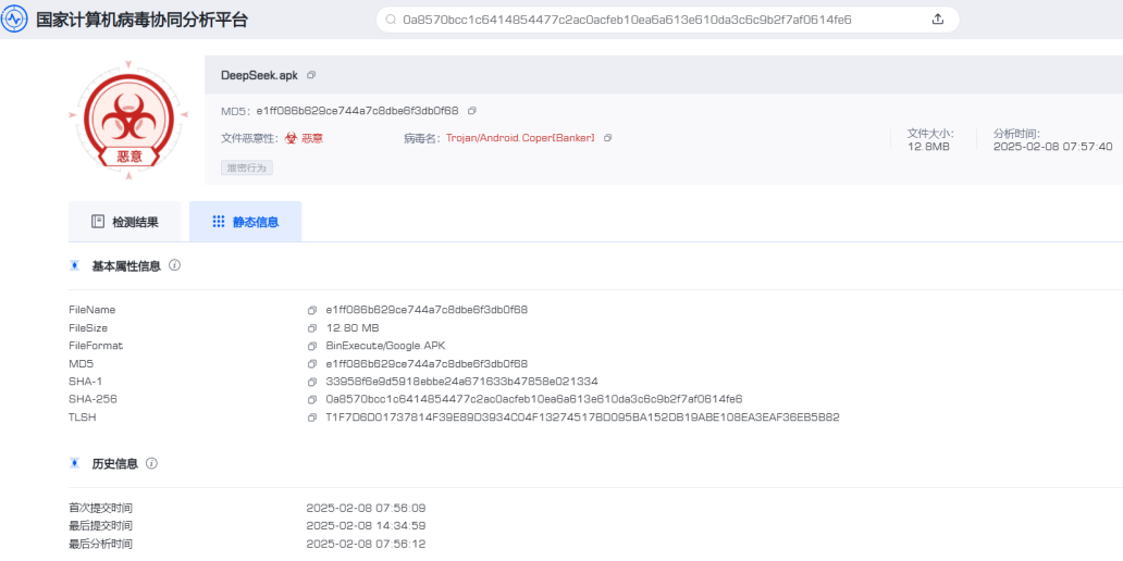 近日,國家計算機病毒應急處理中心和計算機病毒防治技術(shù)國家工程實驗室依托國家計算機病毒協(xié)同分析平臺(virus.cverc.org.cn)在我國境內(nèi)捕獲發(fā)現(xiàn)針對我國用戶的仿冒我國國產(chǎn)人工智能大模型“DeepSeek”官方APP的安卓平臺手機木馬病毒,如圖1、圖2所示。