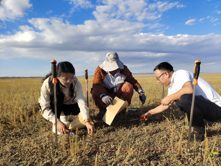 2024年生態(tài)質(zhì)量地面監(jiān)測(cè)中,薄文真(左一)和同事正在采集植物樣本。(受訪者供圖)