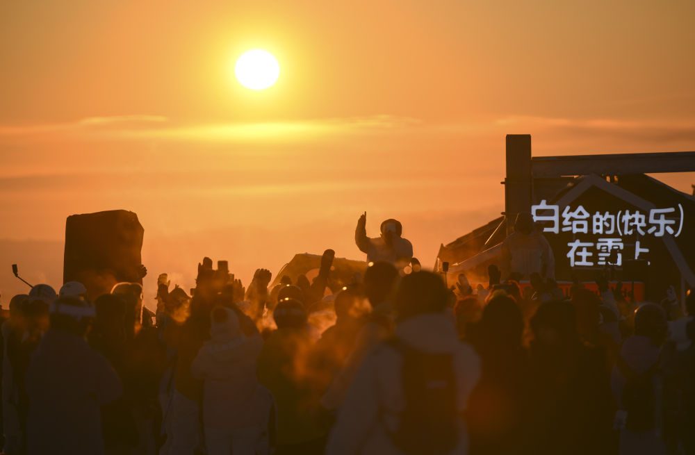 落日余暉灑在阿勒泰市將軍山國際滑雪度假區(qū)的山頂,漫山白雪被染成橙粉色。在現(xiàn)場電子音樂強(qiáng)勁的鼓點中,上千名滑雪愛好者歡呼搖擺,在零下十幾度的雪地里感受“蹦雪迪”的歡快。