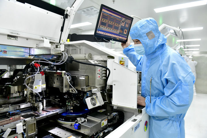 在江蘇昆山丘鈦微電子科技股份有限公司,無塵車間里一條條機(jī)械手臂穩(wěn)步移動,將指甲蓋大小的攝像頭拿起、檢測、再放回托盤。