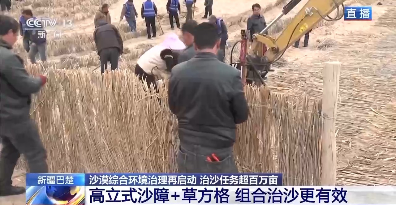 總臺(tái)記者從新疆巴楚縣阿克薩克馬熱勒鄉(xiāng)防沙治沙工程施工現(xiàn)場(chǎng)發(fā)回報(bào)道。當(dāng)?shù)氐?00多名各族干部群眾人工鋪設(shè)“草方格”,也就是將干蘆葦鋪設(shè)在地面,再壓進(jìn)沙土中,它的主要作用是固沙。