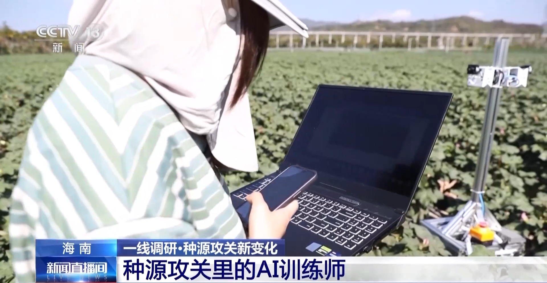 在南繁基地的這塊棉花田里,我們看到這樣的場景,一群年輕人在操作著機(jī)器人,帶著筆記本電腦,給棉花植株拍視頻。他們也被稱為農(nóng)田里的AI訓(xùn)練師。