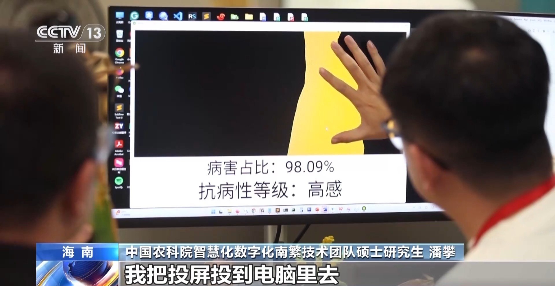 中國農(nóng)業(yè)科學(xué)院智慧化數(shù)字化南繁技術(shù)團(tuán)隊碩士研究生 潘攀:這上面的黃色的部分,就是有病害的部分,這個綠色的部分是,相當(dāng)于是沒有病害的部分。