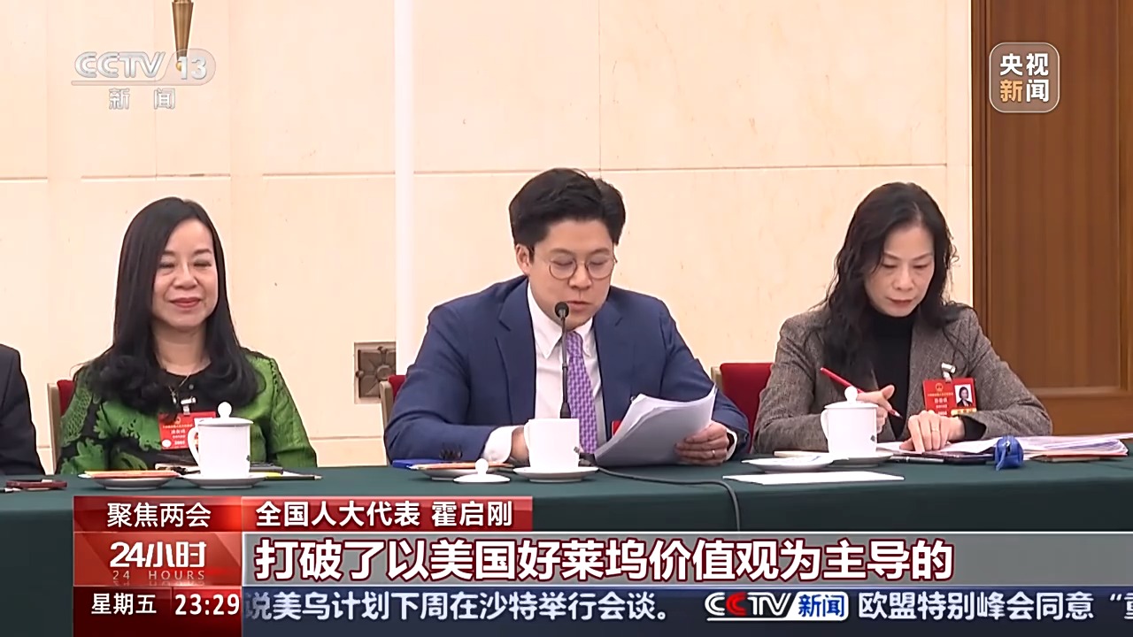 全國人大代表 霍啟剛:最近的《哪吒2》更創(chuàng)下票房歷史,打破了以美國好萊塢價值觀為主導(dǎo)的這種說故事的方式,成功以我們中國的故事和中國的哲學(xué)感染世界的觀眾。我認為香港可以更加用文化+的概念跟理念,在文化產(chǎn)業(yè)發(fā)展上作出更多的貢獻,更以香港國際橋梁和傳統(tǒng)優(yōu)勢,實現(xiàn)中國文化抱團出海等,讓文化事業(yè)和文化產(chǎn)業(yè)得以相輔相成,把香港發(fā)揮成中華文化產(chǎn)業(yè)中的“金融港”和“出口港”。