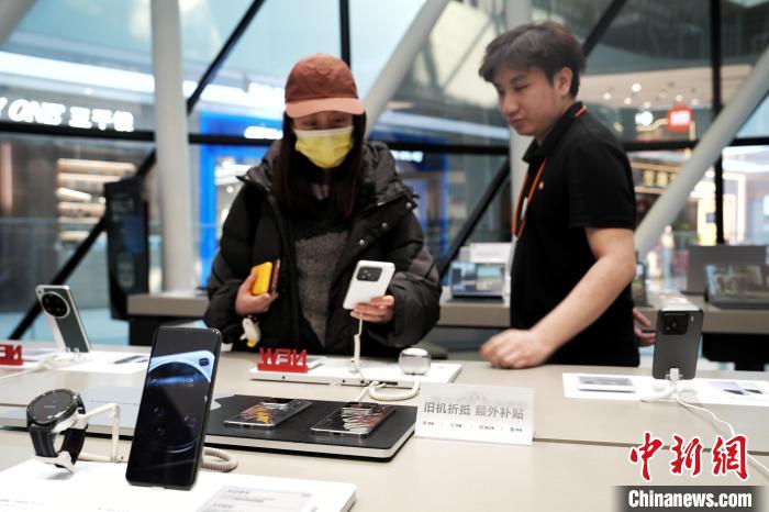 3月5日,消費(fèi)者在北京一門店選購手機(jī)產(chǎn)品。中新社記者 張祥毅 攝