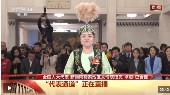 今天(3月11日),十四屆全國(guó)人大三次會(huì)議第三場(chǎng)“代表通道”在人民大會(huì)堂舉行,全國(guó)人大代表、新疆阿勒泰地區(qū)文博院館員卓婭·巴合提接受記者采訪。