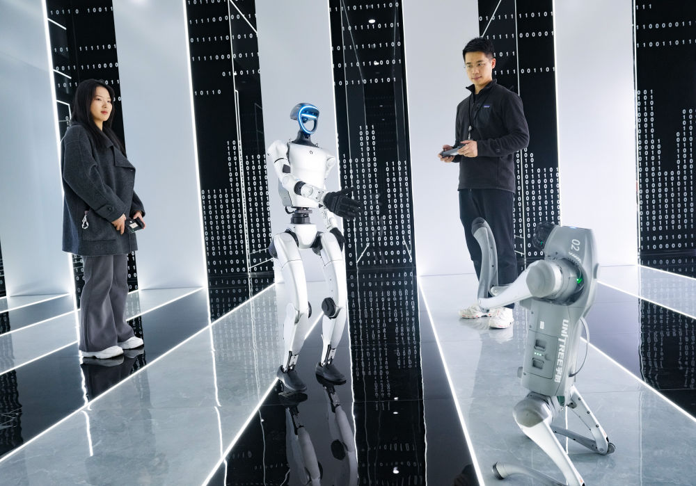 3月1日,在杭州宇樹科技有限公司的產(chǎn)品展示中心,人形機(jī)器人和四足機(jī)器人在工作人員控制下做動作。新華社記者 翁忻旸 攝