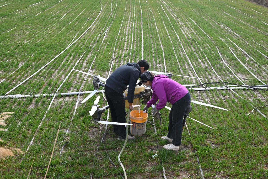 3月18日,在新疆喀什地區(qū)英吉沙縣一麥田,努日曼古麗和丈夫在為無人機(jī)添加農(nóng)藥。新華社記者 尹茹紅 攝