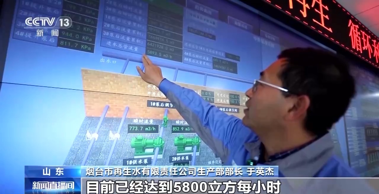 煙臺市再生水有限責任公司生產(chǎn)部部長 于英杰:萬華工業(yè)園區(qū)供水的實時流量顯示,目前已經(jīng)達到5800立方/小時,全天累計14.5萬立方。