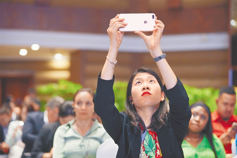 在全球自由貿(mào)易港發(fā)展論壇現(xiàn)場,與會(huì)嘉賓用手機(jī)記錄。海南日?qǐng)?bào)全媒體記者 王程龍 攝