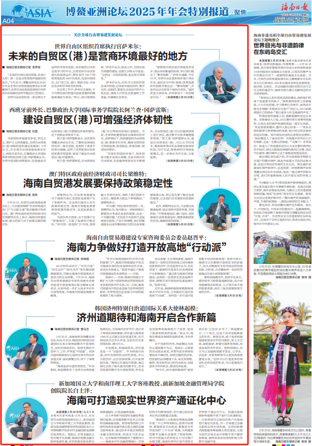 2025年是海南自貿(mào)港封關(guān)運(yùn)作、擴(kuò)大開放之年。當(dāng)天,與會(huì)嘉賓圍繞“自由貿(mào)易港賦能全球經(jīng)貿(mào)合作”“自由貿(mào)易港引領(lǐng)全球自由貿(mào)易進(jìn)程”“自由貿(mào)易港開放門戶與互聯(lián)互通”等議題進(jìn)行深入交流探討,共同描繪自貿(mào)港發(fā)展新藍(lán)圖,為海南自貿(mào)港建設(shè)貢獻(xiàn)“博鰲智慧”。