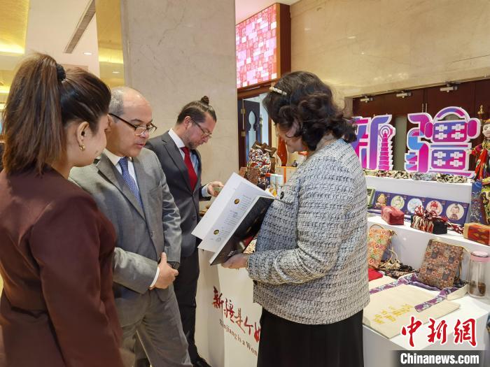 3月31日,新疆在北京舉辦有關國家駐華使節(jié)交流會,來自43個國家和國際組織的70位外賓出席。圖為外賓在新疆特色產品展區(qū)參觀。 中新社記者 徐雪瑩 攝