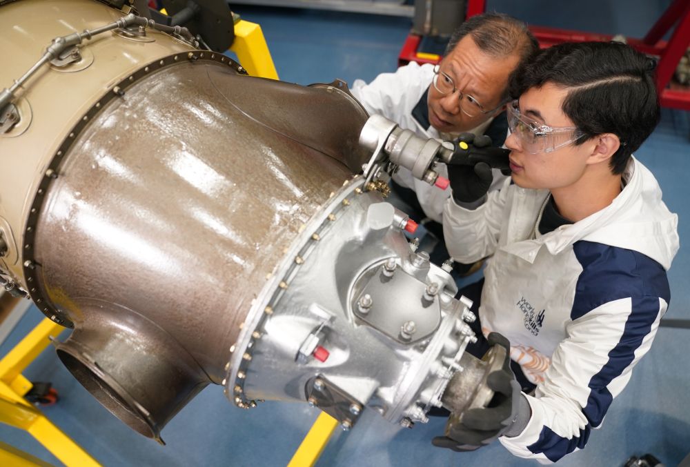 在香港專業(yè)教育學(xué)院,黃富東(右)在檢查渦輪螺旋槳飛機(jī)引擎(1月14日攝)。新華社發(fā)(王申攝)