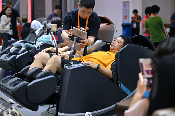 2024年4月17日,參觀者在第四屆消博會上體驗傲勝按摩椅。新華社記者 郭程 攝