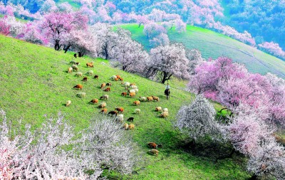 你且看伊犁河谷——蜿蜒的山坡披覆錦繡,層層疊疊的粉白自谷底漫卷山腰。風(fēng)起時,花瓣簌簌飄落,遠處的牧人勒馬駐足?;秀遍g,難辨是大地托起了云霞,還是云霞墜入了人間。