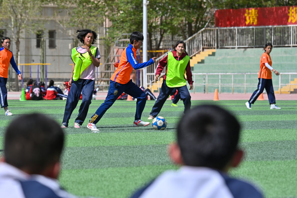 ↑4月10日,在阿圖什市硝魯克中學,球隊中場球員帕提麥·肉孜買買提(左)在進行運球訓練。新華社記者 徐宏巖 攝