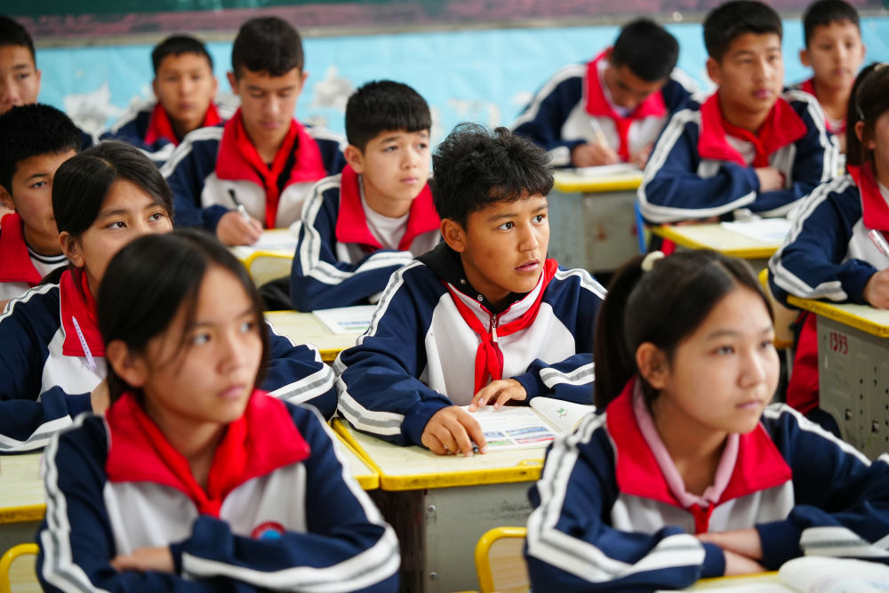 ↑4月14日,在阿圖什市硝魯克中學,球隊前鋒謝爾克努爾·亞力坤(二排左二)在教室里上課。新華社記者 徐宏巖 攝