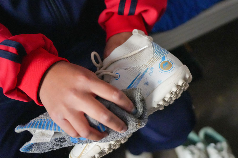 ↑4月10日,在阿圖什市硝魯克中學宿舍,一名球隊球員在擦拭自己心愛的球鞋。球員們的裝備由學校免費發(fā)放。新華社記者 徐宏巖 攝