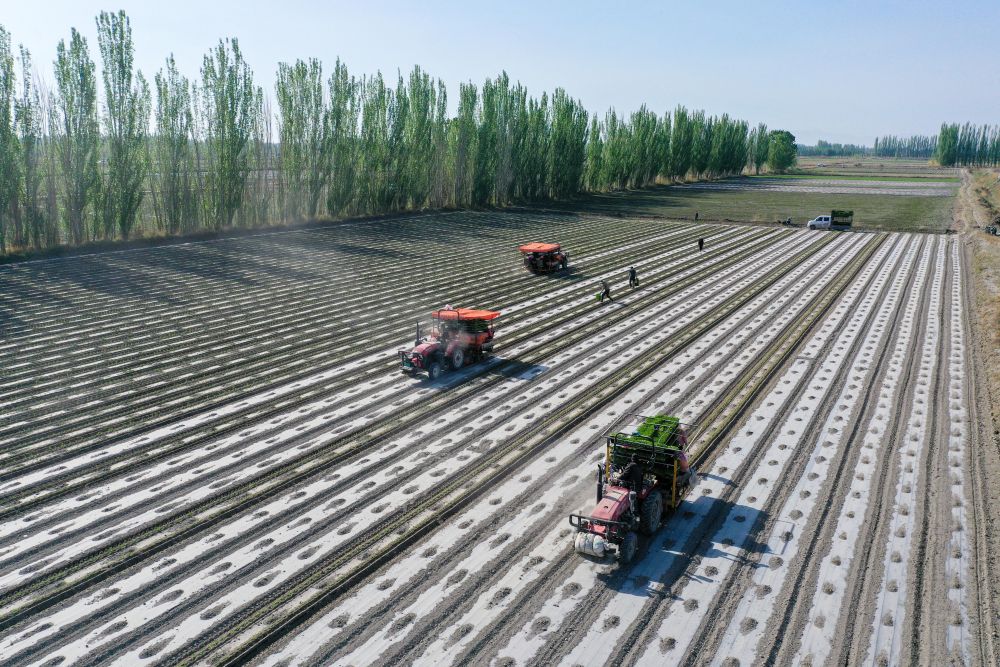 在新疆巴音郭楞蒙古自治州博湖縣本布圖鎮(zhèn),農(nóng)戶操作移栽機(jī)在農(nóng)田里移栽辣椒苗(4月28日攝,無人機(jī)照片)。新華社記者丁磊 攝