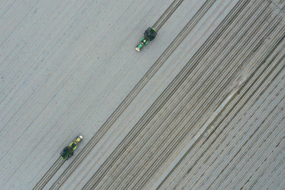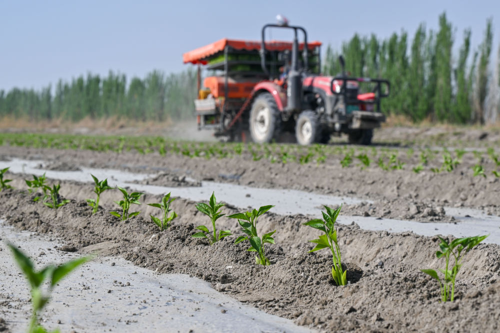 一場(chǎng)春雨不期而至,打濕地皮也“染”綠樹梢,天山南麓遲來的春意更加肆意蔓延。踏上田壟,透過綠茵般的麥田遠(yuǎn)遠(yuǎn)望去,一臺(tái)臺(tái)辣椒自動(dòng)移栽機(jī)正筆直地駛過田野,播下兩行嫩綠的辣椒苗后,蕩起一縷微塵。
