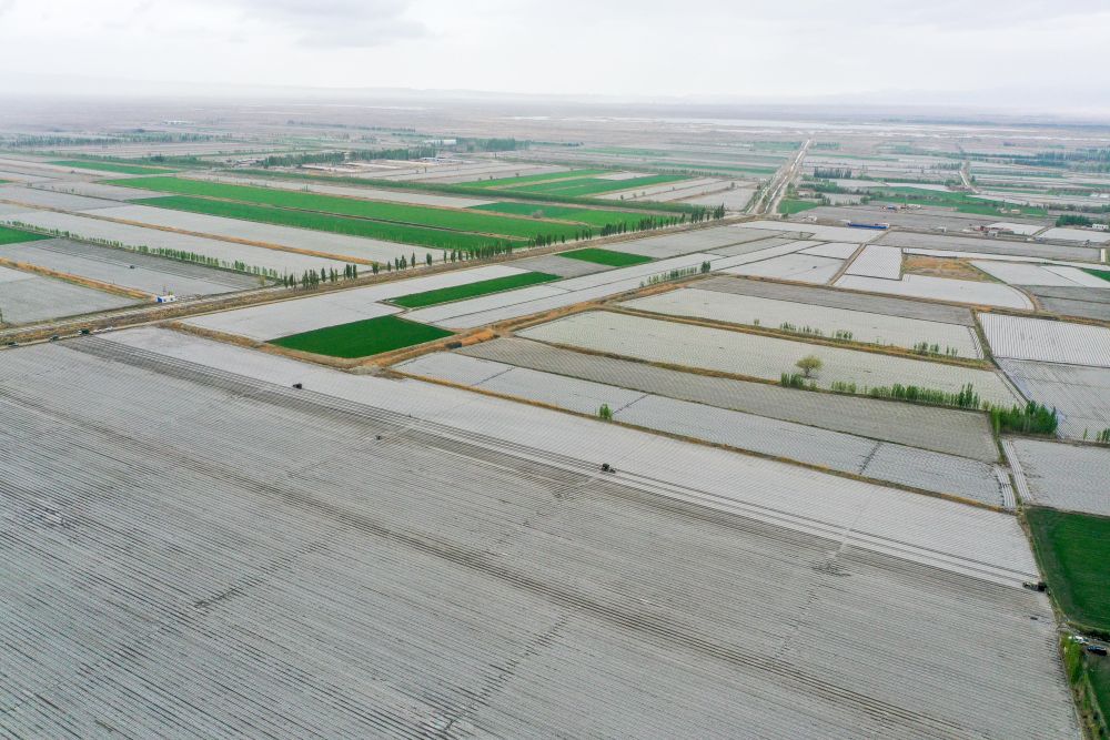 在新疆巴音郭楞蒙古自治州焉耆回族自治縣四十里城子鎮(zhèn),農(nóng)戶操作移栽機(jī)在農(nóng)田里移栽番茄苗(4月26日攝,無人機(jī)照片)。新華社記者丁磊 攝