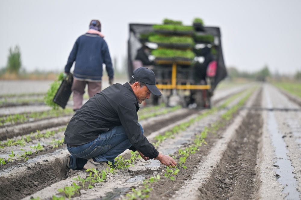 在新疆巴音郭楞蒙古自治州焉耆回族自治縣四十里城子鎮(zhèn),農(nóng)戶檢查栽苗效果(4月26日攝)。新華社記者丁磊 攝