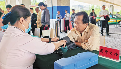 “您這血壓有點高,‘五一’假期活多,別忘了吃藥?!薄坝涀±?,謝謝?!?1歲的司機楊建民在門口的義診攤位量完血壓,整理著衣袖。