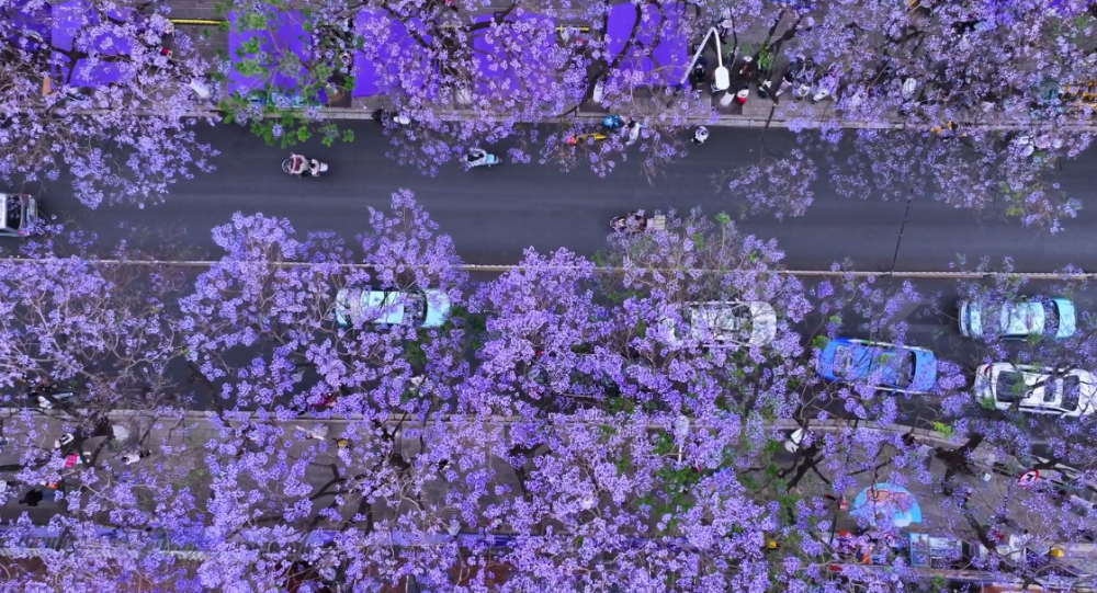 “五一”假期,昆明市教場中路延綿的紫色花海盛開。